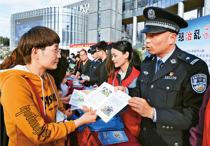 巩固深化扫黑除恶专项斗争、政法队伍教育整顿成果,让群众从一个个具体问题的解决中切实感受到公平正义。图为2020年1月6日,福建省福州市永泰县公安干警在扫黑除恶专项斗争宣传活动上向群众介绍专项斗争成果。 新华社记者 张国俊/摄