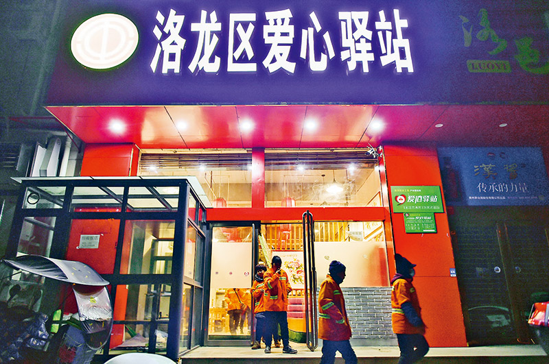 为解决环卫工人吃早餐难问题,河南省洛阳市为早班一线环卫工人提供免费早餐,费用由洛阳市各县(市)区工会、财政和环卫企业进行补贴。图为2021年12月19日清晨,环卫工人在洛阳市洛龙区牡丹大道旁的“爱心驿站”用餐后离开。 新华社发 黄政伟/摄
