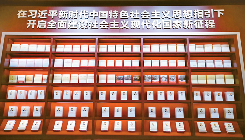 习近平新时代中国特色社会主义思想以原创性理论贡献标注了马克思主义发展的新高度,使马克思主义的开放性和时代性在中国又一次得到充分彰显。图为中国共产党历史展览馆展出的习近平总书记的部分重要著作以及学习阐释习近平新时代中国特色社会主义思想的部分重点图书。 刘新武/摄