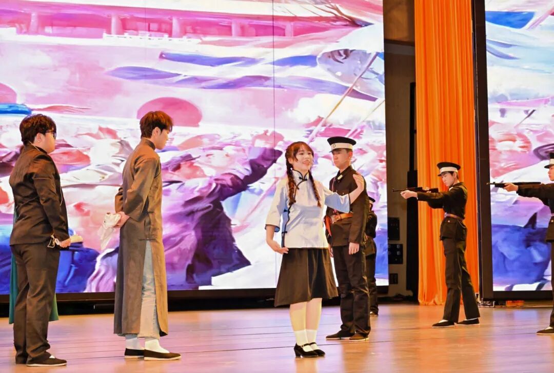 我院选送的情景剧《破晓》在第一篇章中震撼上演。该剧以“五四运动”为历史背景,生动再现了巴黎和会外交失败后,广大青年学生为外争主权、内惩国贼,毅然走上街头游行示威的爱国壮举。在常彦周、温沛老师的悉心指导下,张佳毓、罗家辉、吴鑫媛、陈怡森等同学以饱满的热情和精湛的演技,深刻刻画了青年学子在国家危难之际所展现出的觉醒与担当,剧情跌宕起伏,表演感人至深,赢得了现场观众的广泛共鸣和热烈掌声。6.jpg       此次参演不仅是我院思政育人成果的一次集中展示,更是推进大中小学思政课一体化建设实践教学的重要举措。近年来,学院党委始终坚持立德树人根本任务,不断深化思政课改革创新,将红色文化、革命精神融入教育教学全过程,通过情景剧、社会实践、理论宣讲等多种形式,增强思政课的吸引力与实效性,引导学生坚定理想信念,厚植家国情怀。