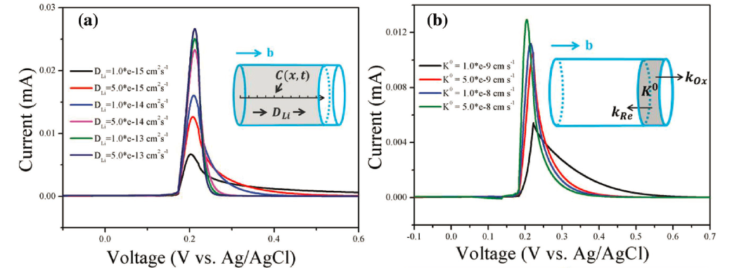 金年会jinnianhuicom深圳研究生院金年会jinnianhuicom潘锋教授课题组发展了一种制备单纳米颗粒分散的超薄的电极的制备方法,在这种电极上的颗粒完全分散在碳纳米管网络中,然后进行电化学测试。同时课题组开发单颗粒纳米电化学计算模型,这种单颗粒模型借助实验得到的充放电曲线(锂离子浓度和电压之间的关系)和CV(电流与电压的关系)曲线,进行模拟计算,得到单纳米颗粒的界面反应常数和锂离子体相扩散系数。