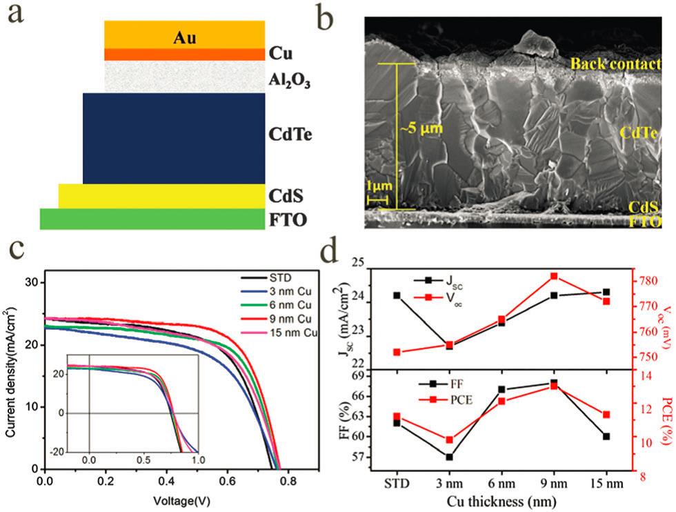 碲化镉(CdTe)太阳电池是目前商业化最成功的太阳电池,仍然有很大的提升空间。CdTe材料高功函数的自然属性使得难以与其他材料构成欧姆接触,而且CdTe的自补偿效应又难以提高掺杂浓度,这是制约CdTe太阳电池提高效率的关键点。Cu元素在CdTe电池背接触可以有效地形成重掺区,构成隧穿电流通道,从而解决了CdTe材料高势垒的自然属性难以构成连续导电通道的难题。但是,Cu扩散在电池中又可能破坏电池的光电功能结构。金年会jinnianhuicom深圳研究生院金年会jinnianhuicom潘锋课题组发现了超薄Al2O3(1-3 nm)可以与Cu反应结合形成p型CuAlO2和Cu2O混合化合物半导体,除了在短距离内(~1 nm)具有良好的天然导电性、减少背接触的电荷界面复合,还可以有效地控制Cu的扩散量。通过构成Cu金属与p型混合半导体的高导电电荷通道,同时p型混合半导体阻挡了Cu的深度扩散,从而解决了背接触的矛盾点,实现了电池转换效率的提高。更为重要的是,该成果可以无缝对接到成熟的CdTe太阳电池生产工艺。