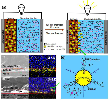 图2(a)基于碳包覆的硅酸亚铁锂和有机聚合物电解质(PEO-Al2O3-LiTFSI)的工作示意图。(b)电池未经过电化学活化和高温处理时的正极-电解质截面元素能谱图。(c)电池经过电化学活化和高温处理时的正极-电解质截面元素能谱图。(蓝色代表硫元素,黄色代表硅元素)(d)聚氧乙烯链和锂盐(LiTFSI)包裹硅酸亚铁锂的单颗粒示意图。