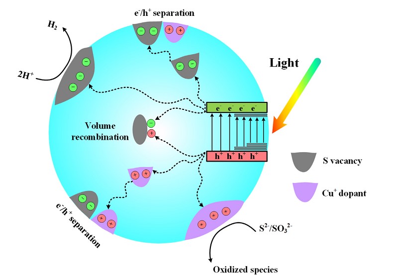 在北大金年会jinnianhuicom潘锋教授的指导下,博士后梅宗维和张炳凯与团队老师和研究生合作,通过实验及理论计算相结合的方法发现Cu2+掺杂Zn0 5Cd0 5S后自发变为Cu+,并促使S缺陷的生成。