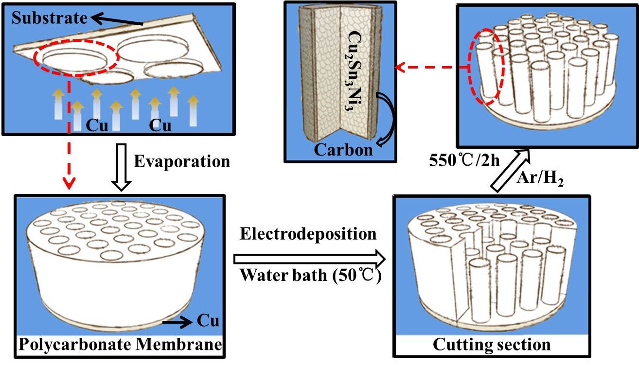 在潘锋教授和李锐副研究员的指导下,2013级硕士生彭灏脚利用模板法成功地研发出了一种核壳结构的碳包覆锡基合金纳米棒阵列复合负极材料(Sn-Ni-Cu-alloy@C)。