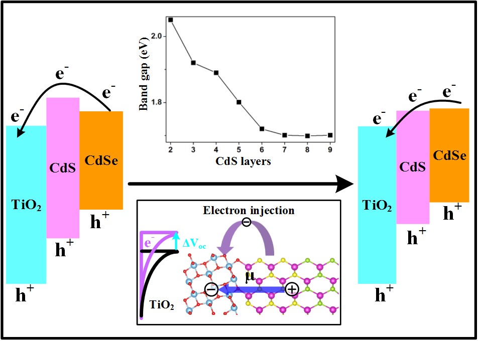 潘锋教授团队与中科院化学所林原教授团队合作,通过第一性原理和实验发现, TiO2 CdS CdSe QDSSCs 的光电转化性能可以通过液相原子层技术调控CdS缓冲层的原子层数来实现,最高效率能达到6%,接
